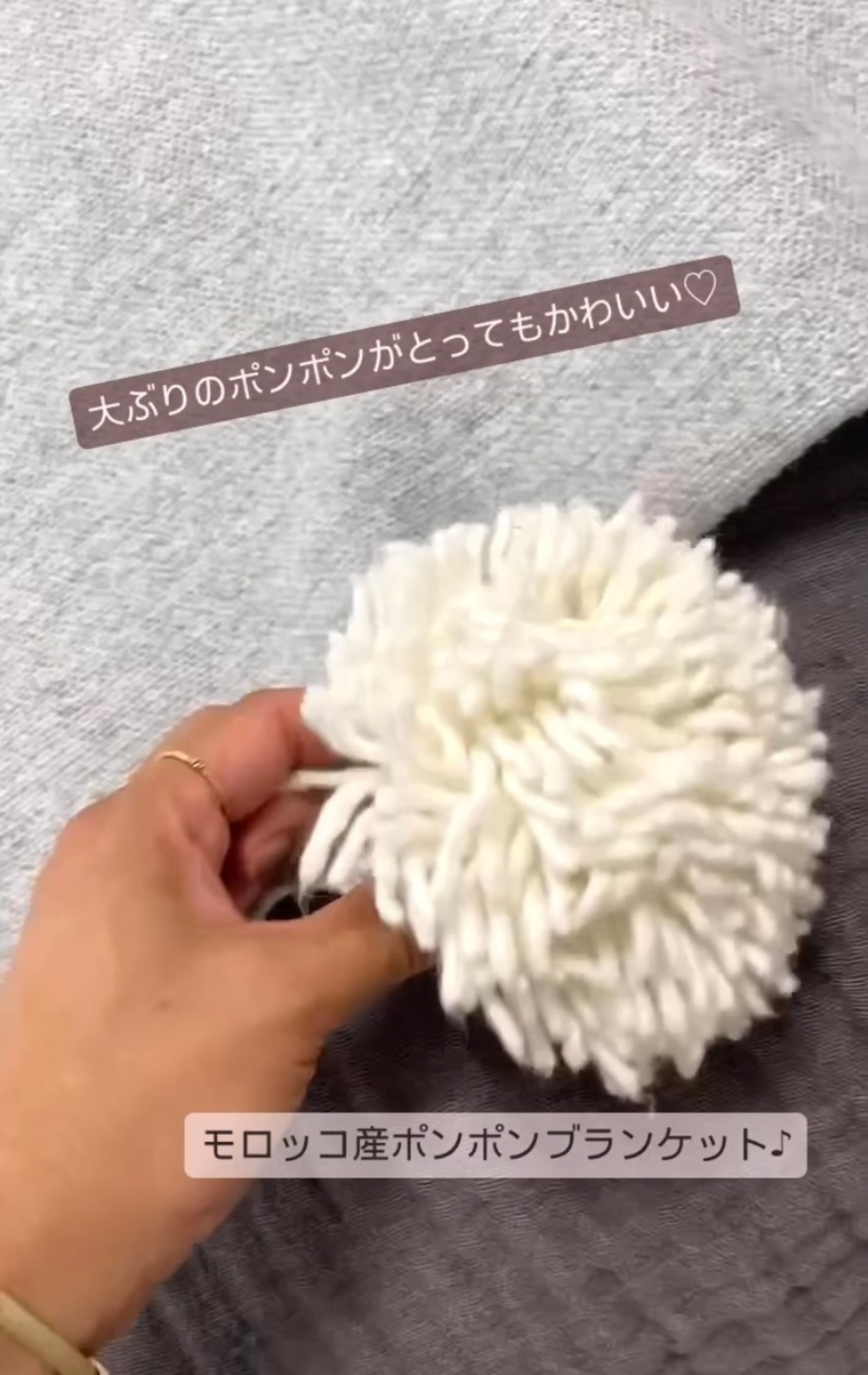 グレーのブランケットに白のポンポンがついています。